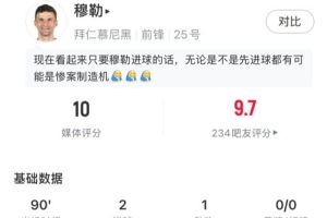 体育资讯6月16日讯 世俱杯小组赛首轮,拜仁10-0奥克兰城,穆勒首发出战打满全场,球员此役数据如下: